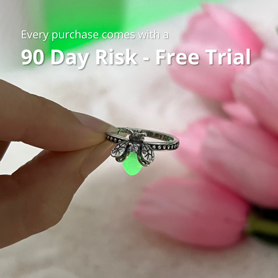 The ring is made of a high-quality silver-tone metal alloy. The glowing firefly detail is crafted with a special luminous material designed to glow in the dark.